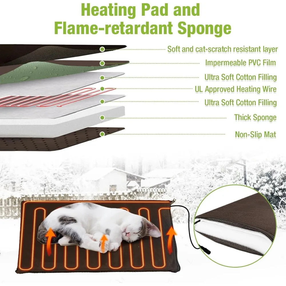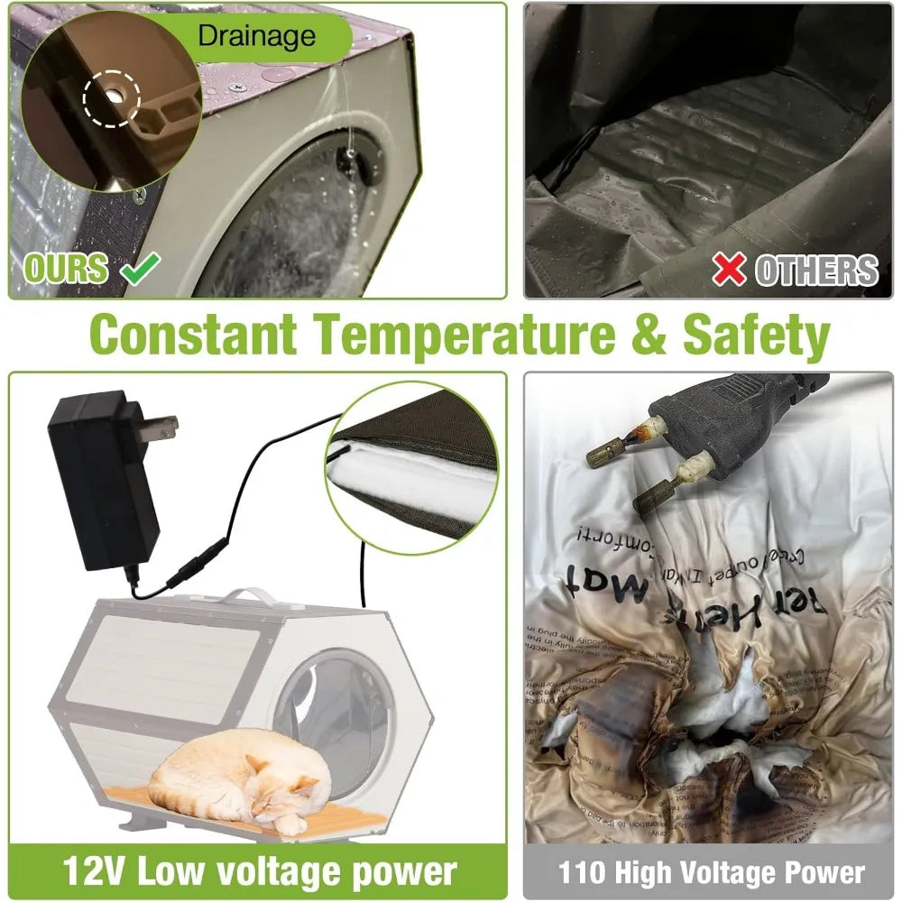 - All-Season Comfort: This Outdoor Cat House features a safe heated pad with 12V low-voltage certification, ensuring a cozy temperature all year round. It keeps your pet warm and safe, free from overheating risks