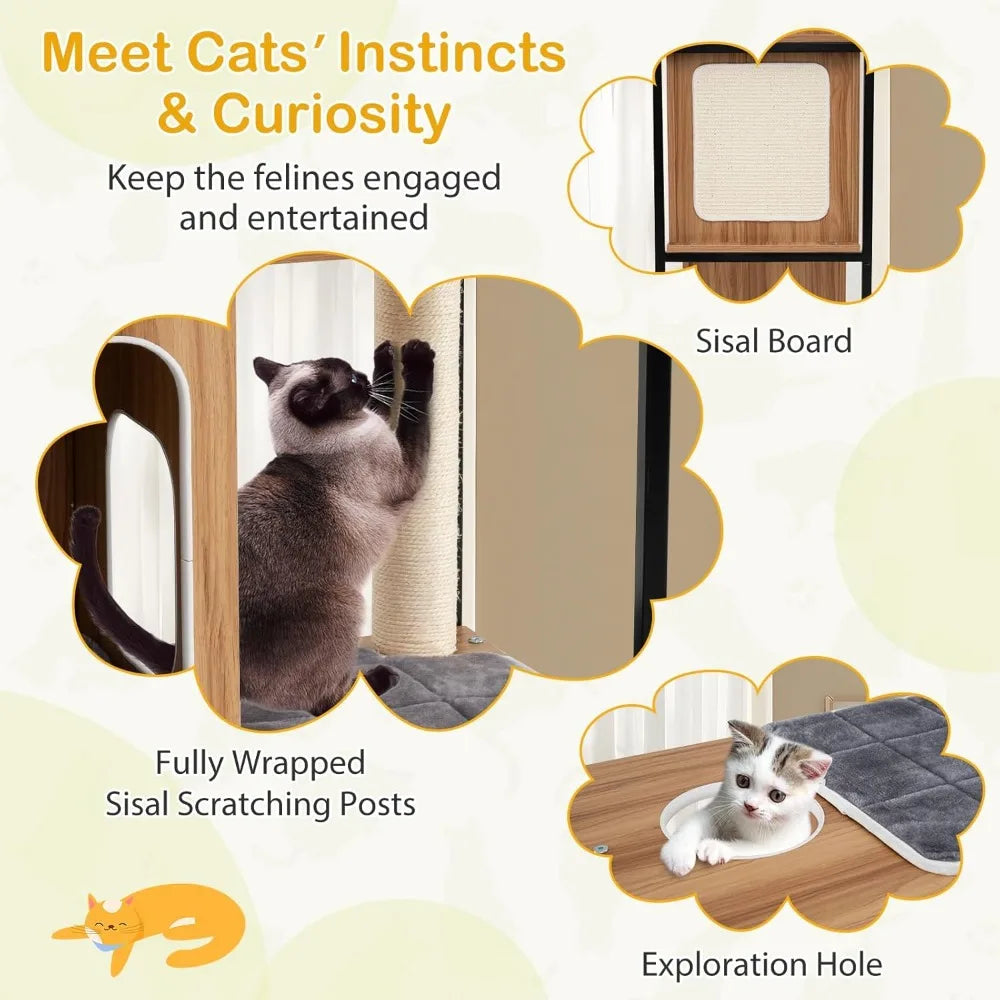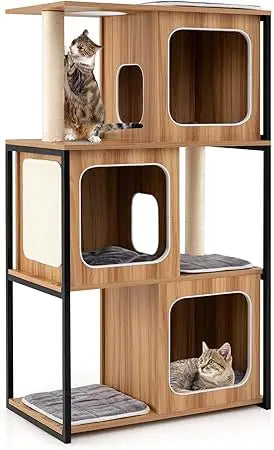 - Effective Scratching Solution: To meet cat's instincts & curiosity, the wood cat tower incorporates sisal-covered posts and pads. This setup not only helps in maintaining healthy feline claws but also deters cats from clawing other household furniture.