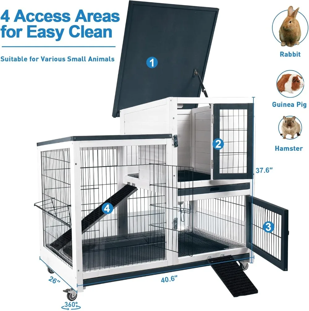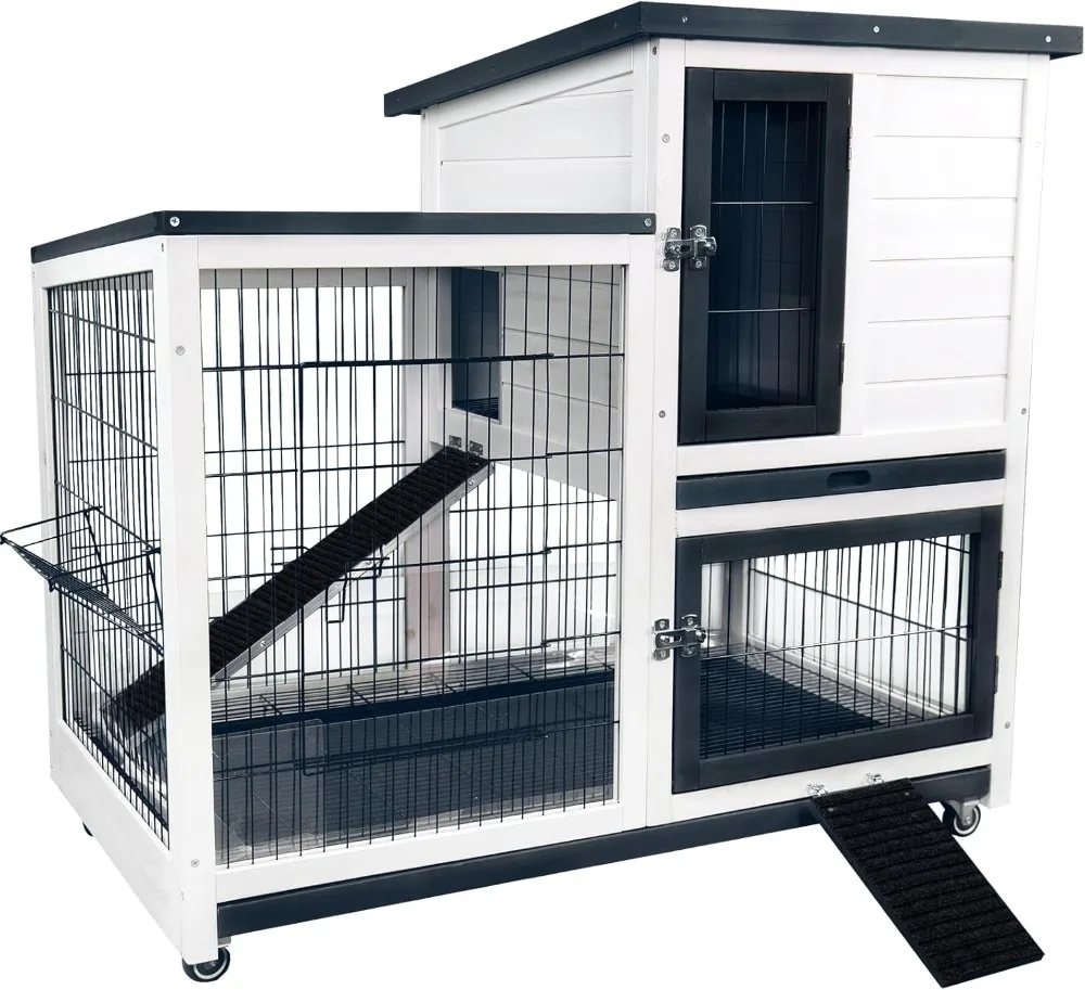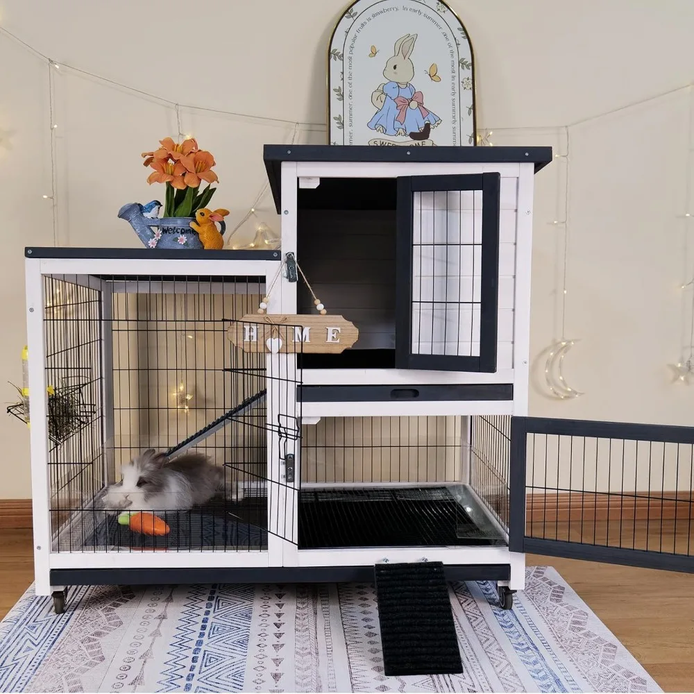 Rabbit Hutch Indoor Bunny Cage Outdoor with Urine Guards 2 Storey Mobile Guinea Pig Cage Wire Bottom 2 Trays