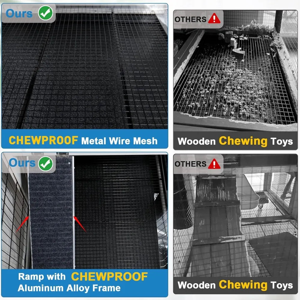 - Chew Proof Design: Bottom wire mesh above the lower tray and aluminum alloy frames with the ramp & entrance to prevent rabbits from using them as chewing toys, extending their service life