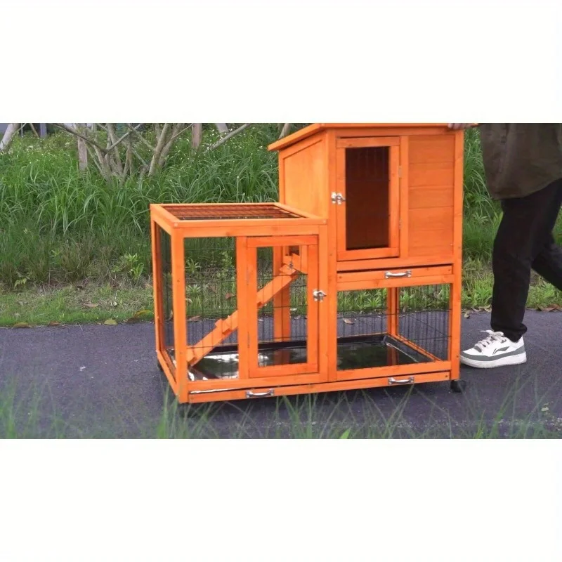 Rabbit Hutch Small Animal Outdoor Pen w/ 4 Casters Cleaning Trays