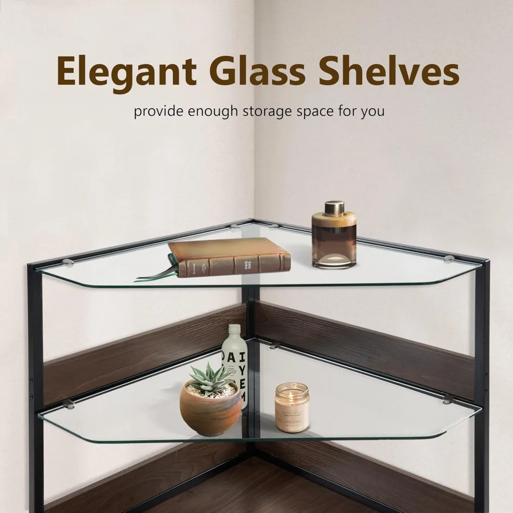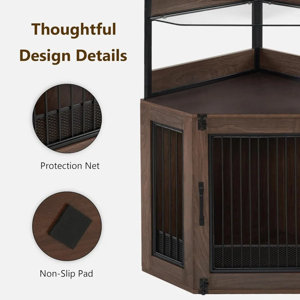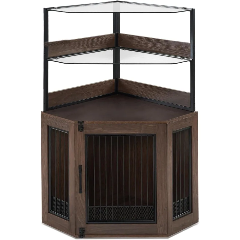 Small Corner Dog Crate Furniture with Glass Shelves, Wooden Dog Kennel Furniture with Door, Pet Crate Indoor Use, CN17 (Brown)